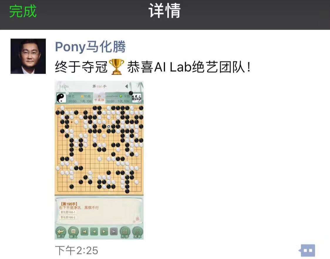 騰訊的圍棋AI“絕藝”參加了在日本舉辦的第10屆UEC杯世界計(jì)算機(jī)圍棋大賽并奪得了冠軍,馬化騰也在朋友圈發(fā)電祝賀。